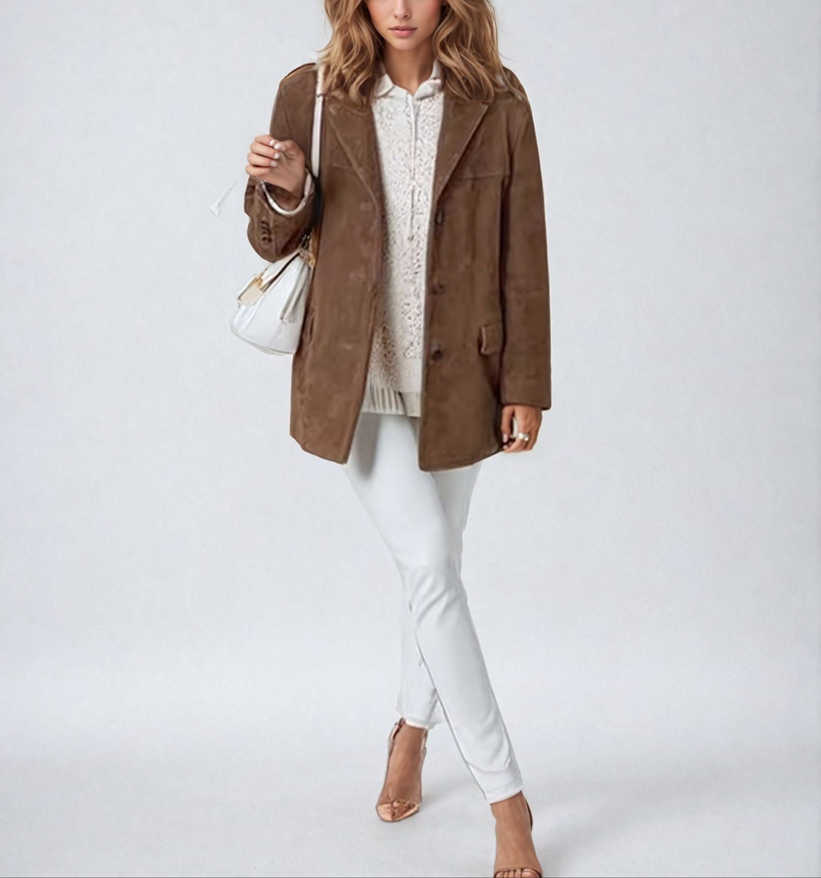 Envuelve tu estilo en lujo con la chaqueta Helena, confeccionada en ante suave de color marrón. Esta pieza es perfecta para cualquier ocasión, añadiendo un toque de clase y sofisticación a tu look, sin esfuerzo. Su diseño minimalista asegura que nunca pase de moda, mientras que su ajuste favorecedor realza tu figura en cualquier tipo de cuerpo.