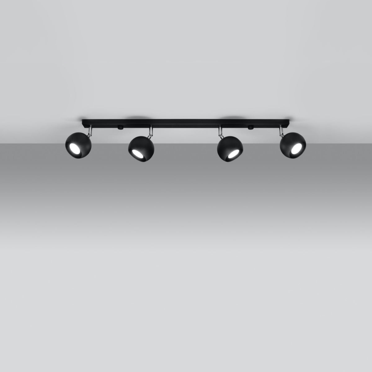 Lámpara de techo con 4 focos GU10 en acabado negro, cuerpo de acero y dimensiones 80 x 10 x 16 cm. Ideal para pasillos, recibidores, cocinas y salones, aporta iluminación direccionable con un toque contemporáneo y elegante.
